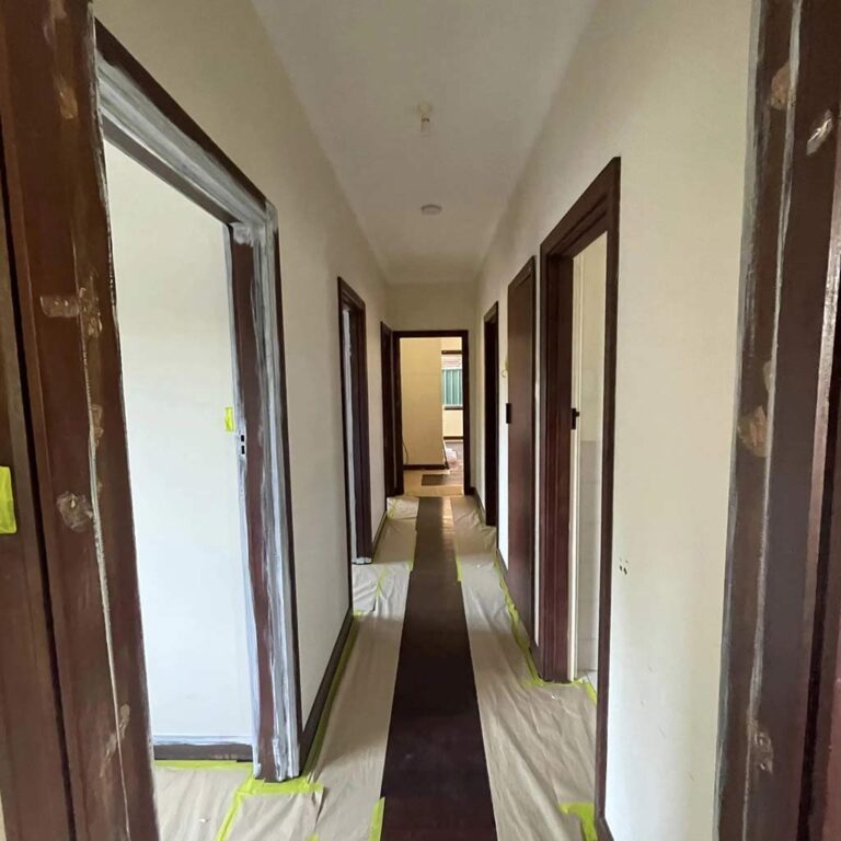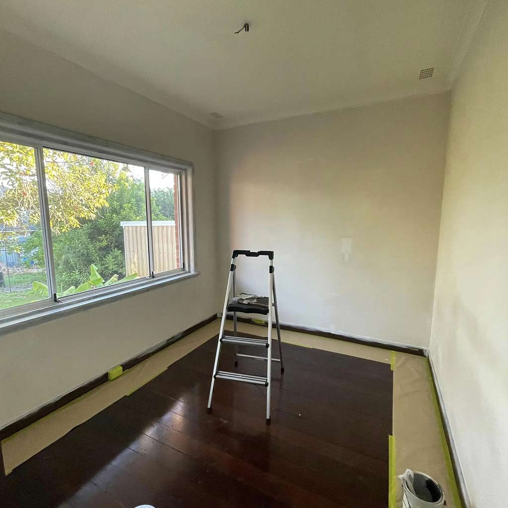 Our work began with thorough surface preparation, ensuring that all areas were free from imperfections and ready for paint. We started with the brown timber door frames and skirting boards, applying a shellac based primer for wood to prevent any timber bleed-through.
